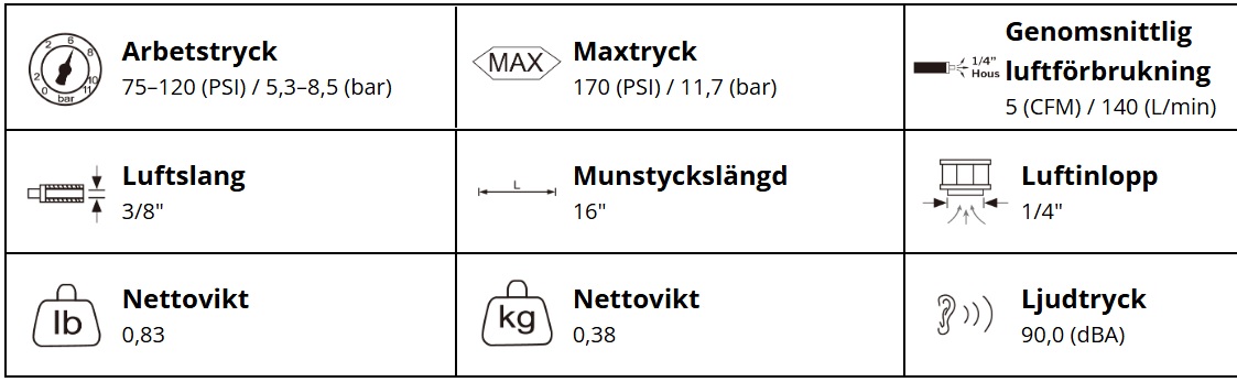 • Arbetstryck: 5,3–8,5 bar